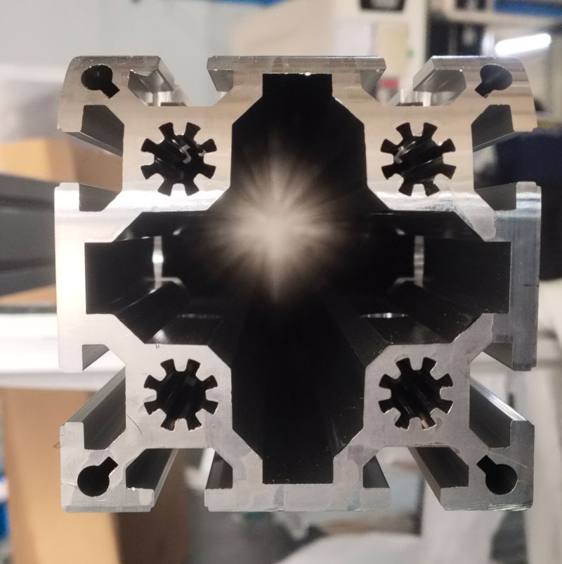 今天給大家介紹大規格的工業鋁型材,它就是歐標100乘100鋁型材,利用鋁合金加工性能優良的特點,使用模具將圓柱形鋁錠擠壓加工而成。其截面尺寸是100mm乘100mm,整支長度是6.02米,可以根據需求進行切割。