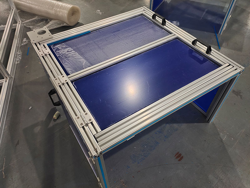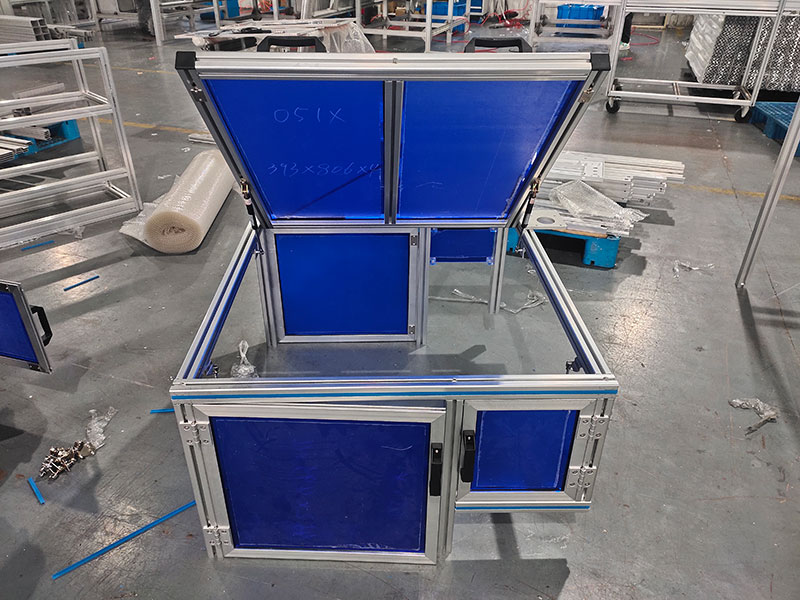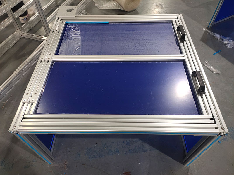 這個鋁型材設備防護罩頂部蓋板可以打開一個角度并固定住,也可以輕輕蓋上。實現這一功能的是蓋板上安裝的氣彈簧。氣彈簧又被稱為支撐桿、氣支撐、調角器、氣壓棒、阻尼器等,是一種可以實現支撐、緩沖、制動、高度及角度調節等功能的零件,在工程機械中,主要應用于罩蓋、門等部位。